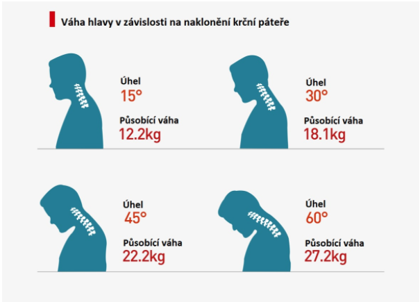 A to nejhorší? Koukat celý den do notebooku, tam je bolest krční páteře a hlavy téměř zaručená… Na našem diagramu se můžete podívat, jakou váhou hlava zatěžuje krční páteř v závislosti na naklonění hlavy.