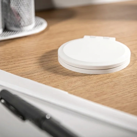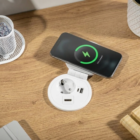 Zásuvkový modul zapustený do dosky stola ‣ otvárací kryt obsahujúci indukčnú nabíjačku ‣ zásuvka 230V AC/16A ‣ dva porty USB typu A a C ‣ výmenný priechodný modul ‣ biela farba
