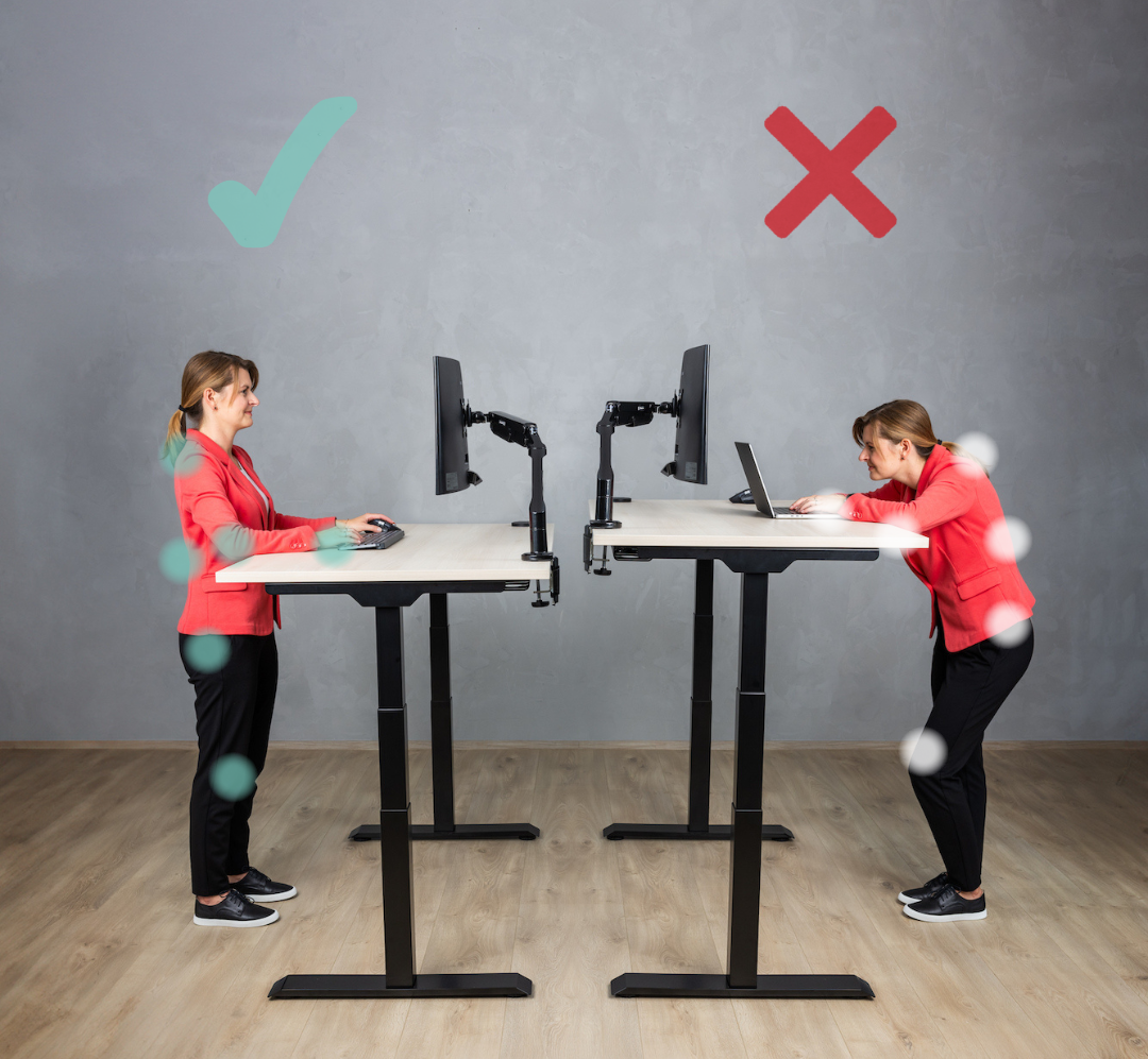 Pre nastavenie pracoviska v sede musíme najskôr nastaviť výšku stoličky, potom prispôsobiť výšku stola tak, aby nám ruky plynulo prechádzali z podrúčky kancelárskej stoličky na pracovný stôl.